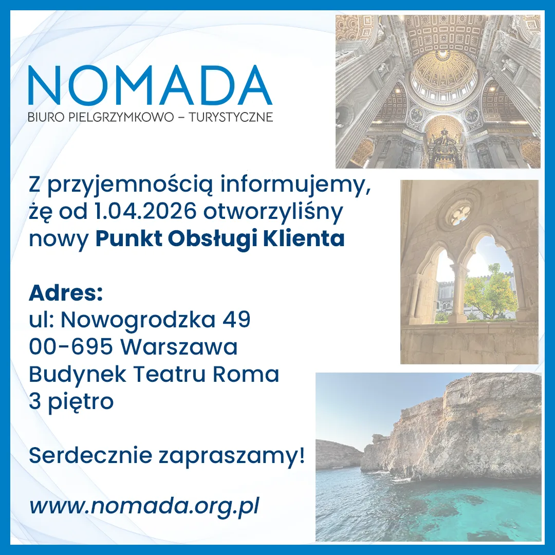 NOMADA Biuro Pielgrzymkowo-Turystyczne Sp. z o.o. z siedzibą w Warszawie to gwarancja profesjonalnej organizacji wyjazdów pielgrzymkowych oraz turystycznych. Istniejemy na rynku pielgrzymkowo-turystycznym od 1991 roku, a organizowane przez nas podróże spełniają wszystkie wymogi prawne regulujące obszar rynku turystycznego. Wybierając biuro NOMADA Klient ma pewność, że wyjazd zostanie zrealizowany zgodnie z obowiązującymi przepisami oraz że znając realia wszystkich obsługiwanych przez kierunków wywiązujemy się z przedstawionej oferty. Dajemy gwarancję najwyższej jakości. Liczy się nie ilość, a jakość.